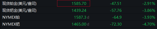 事實上,不僅黃金白銀,整個貴金屬市場全線下跌,截至發稿,現貨鉑金跌近3%,NYMEX鉑跌近4%,此前均一度跌超5%;現貨鈀金跌3.86%,盤中一度跌超5%,NYMEX鈀跌4.7%,盤中一度跌超6%。
