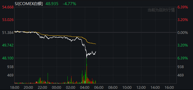 白銀期現的跳水則更為猛烈,均一度跌超6%。截至發稿,倫敦銀現跌4.38%,報50.094美元/盎司;COMEX白銀跌4.77%,報48.935美元/盎司。