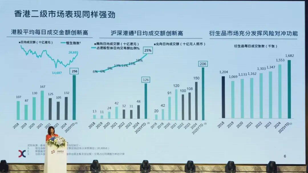 陳翊庭表示,上半年滬深股通和港股通平均每日成交金額均創新高。截至9月底,滬股通和深股通的日均成交額達到人民幣2064億元,同比上升68%。而港股通的日均成交額達到1260億港元,是2024年的兩倍以上。互聯互通機制已成為推動中國資本市場雙向開放的重要橋梁。