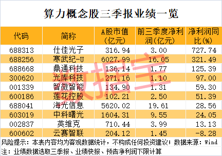 從目前已披露的業(yè)績數(shù)據(jù)來看,按照三季報、業(yè)績快報、預告凈利潤下限(無下限則取公告數(shù)值)計算,今年前三季度凈利潤同比增長(含扭虧為盈)的算力概念股有9只,如仕佳光子、寒武紀-U、鼎通科技、光庫科技、智微智能等。